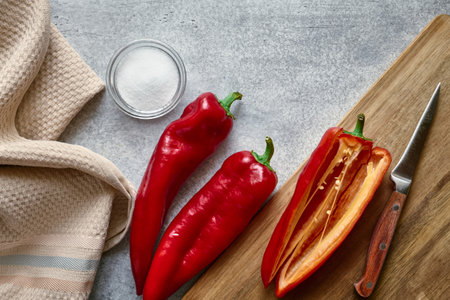 Two ugly fresh red peppers on a gray stone background. Horizontally, with space, top view