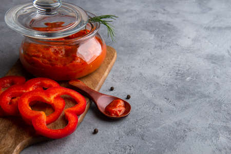 Glass jar with ajvar, lutenitza on a gray background. Copy space