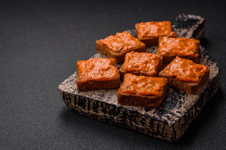 Delicious sandwich consisting of toast, red sauce with salt, spices and herbs on a dark concrete background