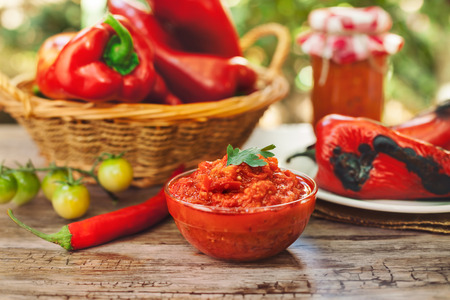 Ajvar served on table in glass bowl,red peppers and tomatoes