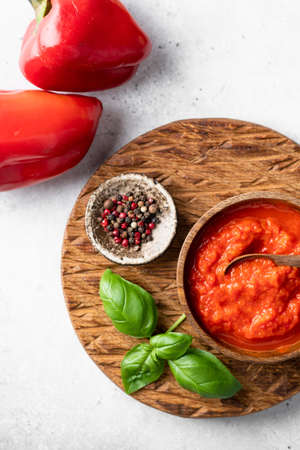 Balkan traditional sauce ajvar on a wooden cutting board, view from above