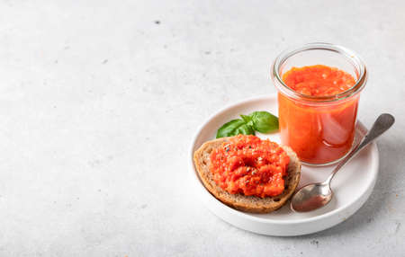 Slice of rye bread and homemade pasta ajvar. Vegetable sauce or caviar of baked red bell pepper on grey. Balkan appetizer cuisine. Horizontal orientation. Space for text. Top view.