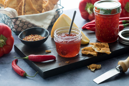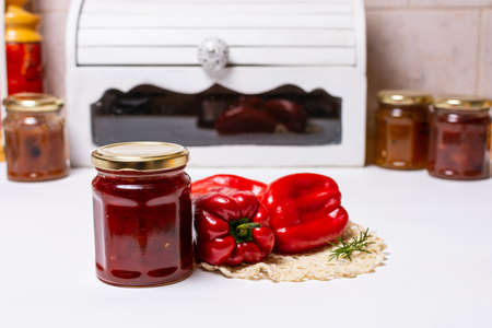 Hot pepper jelly. Sweet bell pepper and chili pepper sauce, confiture, jam in a glass jar.