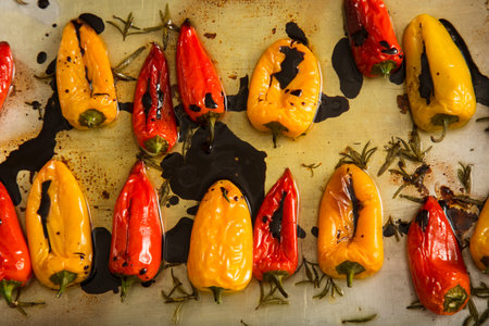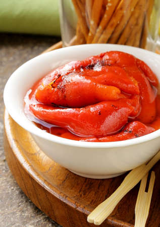 Owen-baked red paprika peppers with garlic and olive oil. Toned picture