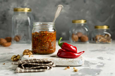Homemade sauce adjika with hot pepper, garlic, basil, parsley and walnuts. Tabasco