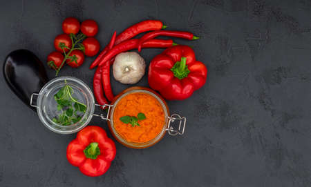 Traditional autumn Balkan vegan spread Ajvar or Aivar with ingredients. Homemade relish. Top view, copy space