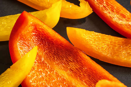 Bulgarian pepper of three colors laid out in a row on black wooden background. Abstract image of traffic light. Concept of healthy eating.