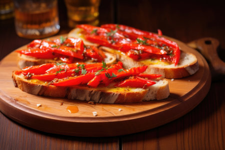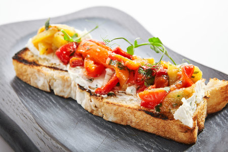 Delicious bruschetta with baked peppers close up view. Tasty roasted bread with cheese and vegetables. Traditional italian antipasto with greenery on wooden tray. European cuisine, food composition