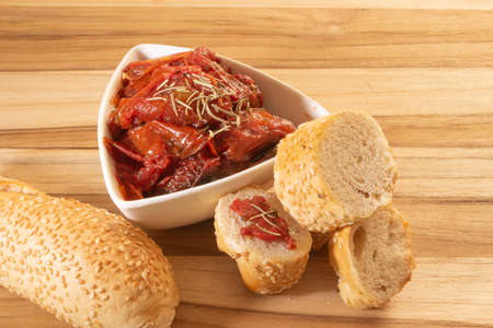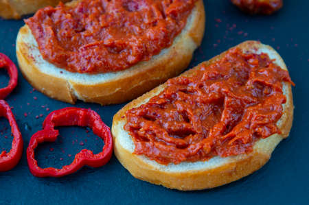 Homemade bruschetta with red pesto sauce, dried red ripe tomatoes and peppers, close up