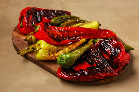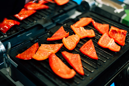 Grilled red bell peppers, vegetarian food. Red bell peppers as a food background for your design.