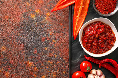 Composition with tasty chili sauce and ingredients on grunge background, closeup