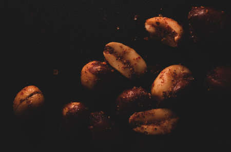 Roasted peeled peanuts closeup, salty beer snack on dark background
