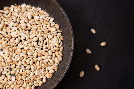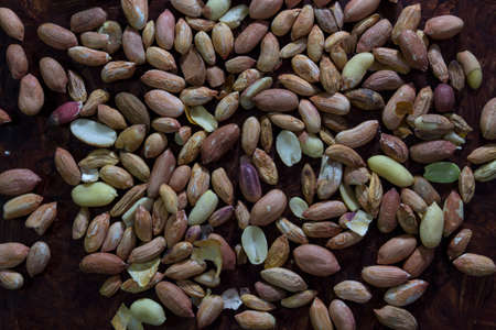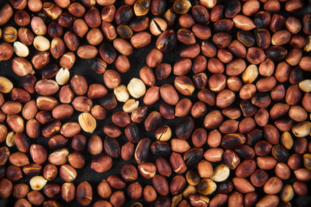 Raw unshelled peanuts in the shell. Organic groundnut. Black background. The view from the top.