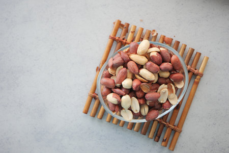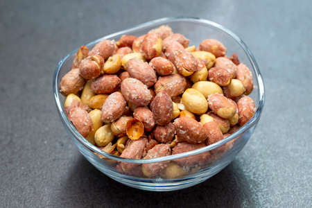 Steamed peanuts in a glass bowl. Groundnuts unpeeled in a bowl.