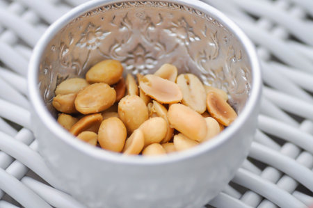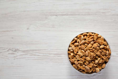 Roasted salted peanuts in white ceramic bowl on white marble background.