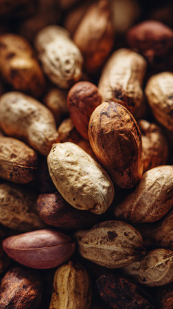 Macro image showcasing a heap of raw peanuts still encased in their textured, earthy-toned shells, highlighting their natural imperfections and organic shapes.