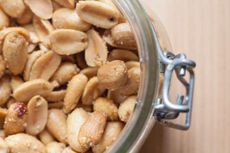 Open canning jar with fried salty peanuts. Selective focus. high-angle view