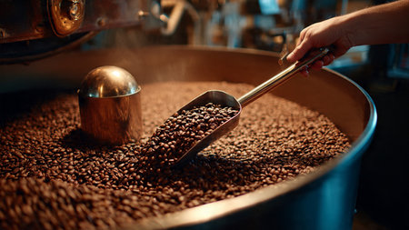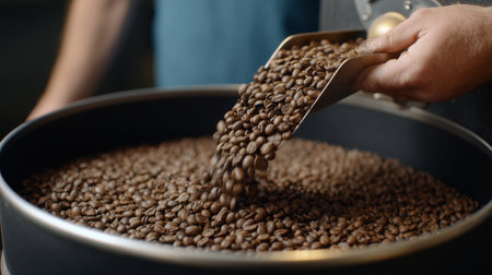 A skilled barista showcases his artistry by carefully handling fresh coffee beans in a copper roasting drum, highlighting the rich textures and aromas of the roasting process.