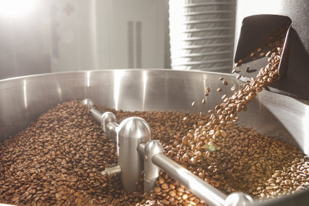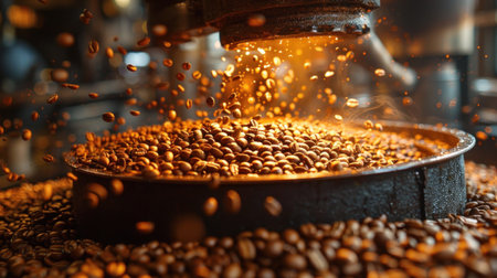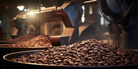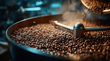 A close-up view of freshly roasted coffee beans in an industrial roaster, capturing the rich textures and aromas of this beloved beverage in the roasting process.