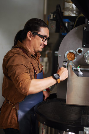 Male worker using industrial coffee roasting machine