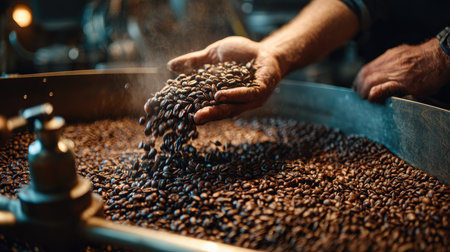 Close-up of hands roasting coffee beans in industrial roaster for artisanal coffee production. concept of culinary craftsmanship, espresso creation, aromatic beverage making.