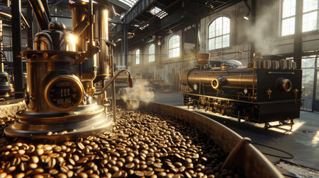 A vintage steam engine chugging along in a bustling factory filled with aromatic coffee beans.