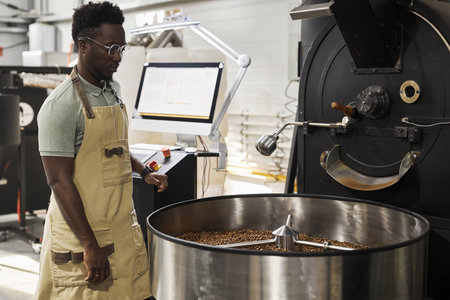 Portrait of African American young man watching coffee roasting process and operating machines, copy space