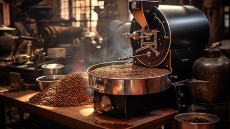 A skilled artisan meticulously roasts fresh coffee beans in a modern roasting machine, releasing rich aromas and steam. The craft illustrates passion and dedication.