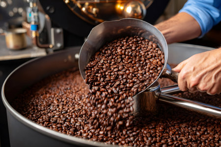 A close-up image features a hand scooping freshly roasted coffee beans from a large metal container, capturing the rich texture and aroma of the coffee.