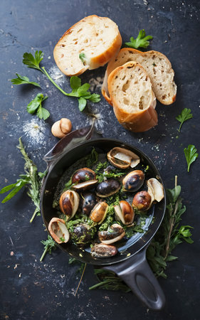 baked snails with garlic butter fresh herbs frying pan selective focus