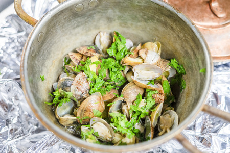 Clams with garlic and coriander in a copper, bronze pot with lid