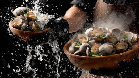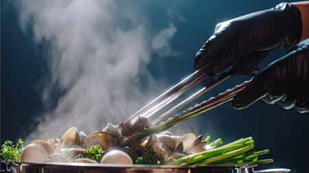 Chef in black apron is cooking steamed clams with herbs and spices on black background