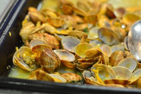 Clams cooked in the recipe almejas a la marinera background in a studio shot