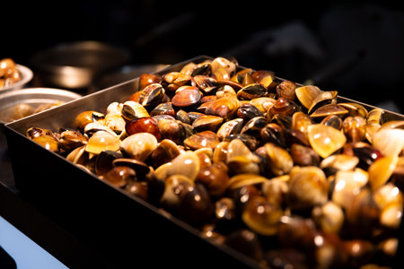 AI generated top view of fresh striped clams grilled over charcoal, some shells open revealing succulent meat inside. Perfectly cooked with smoky aroma, seasoned with salt and black pepper, garnished.