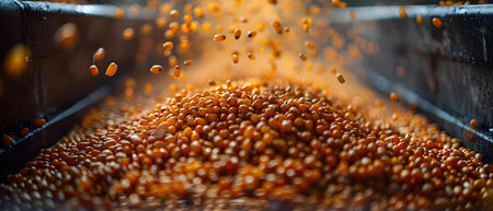 A stunning view of grains cascading from machinery, creating a cloud of dust in an industrial setting, showcasing the beauty of agricultural processing technology.