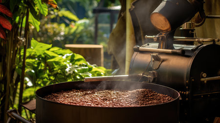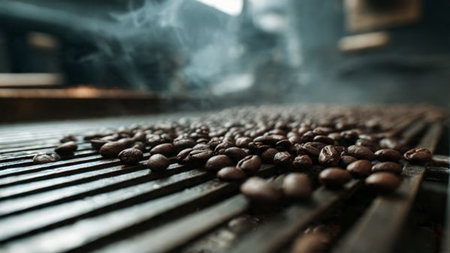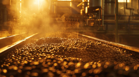 coffee beans, roasting process, industrial setting, warm lighting, production line, machinery, steam, brown tones, aromatic, food production, close up shot, rich texture, golden hues, cozy atmosphere