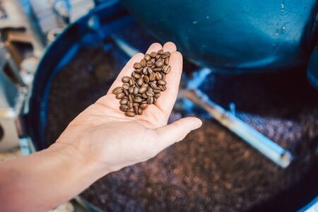 worker took Freshly roasted coffee to check the quality of the mixer drum for cooling