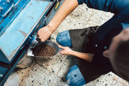 Roasted coffee beans from roaster machine pouring into the special box for selling