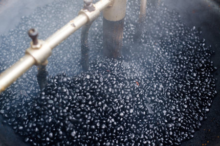 Coffee beans being roasted in a roasting machine, close-up