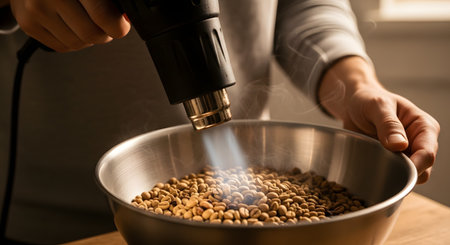 A person is using a black heat gun to roast green coffee beans in a large stainless steel bowl. Wisps of smoke or steam rise from the beans as they are heated, indicating the roasting process. This image represents DIY coffee roasting, artisan coffee, and a hobby.