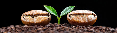 A close-up image showcases coffee beans beside a young plant sprouting from dark soil, highlighting the connection between nature and agriculture.