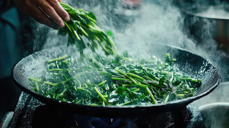 A close-up of a chef's hand adding fresh greens to a hot wok, creating steam and showcasing a vibrant cooking process in a bustling kitchen environment.