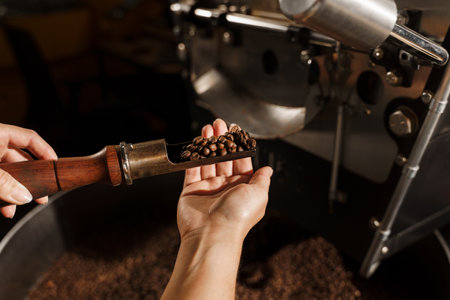 A dedicated artisan examines freshly roasted coffee beans in a cozy roastery environment, showcasing the skill and attention to detail in coffee production.