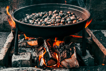 A closeup shot of a pan of chestnuts roasting on the fire