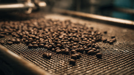 Roasted coffee beans on a conveyor belt in a coffee factory