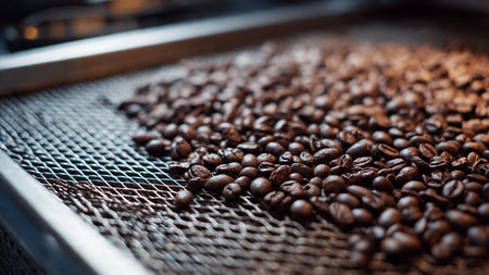 roasted coffee beans on a conveyor belt in a coffee shop