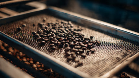 A detailed view of coffee beans flowing along a conveyor belt in an industrial setting, showcasing the processing and production of high-quality coffee.