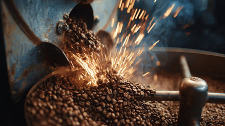 Coffee beans being roasted in a roasting machine with sparks
