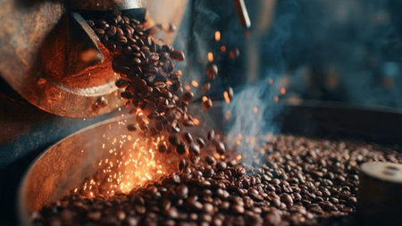 A captivating close-up of hands carefully selecting roasted coffee beans in a steam-filled roasting machine, showcasing the intricate process and artisanal craft behind coffee production.