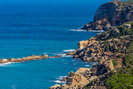High angle view of sea waves and sea shore with rocky cliff shore. Landscape, sea and nature concept.